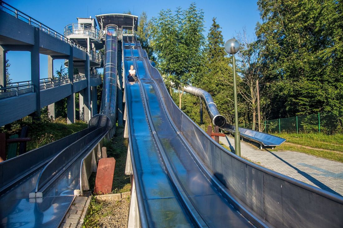 RAJSKIE ŚLIZGAWKI NA GÓRZE PARKOWEJ Świetna zabawa dla każdego bez względu na wiek. Bezpieczna szybkość - wspaniałe emocje! Rajskie ślizgawki to zjazdy zjeżdżalniami rurowymi od spokojnej fali, przez spiralę po zjeżdżalnię-Kamikadze. Różnica wysokości: 12 metrów. Rajskie ślizgawki w Krynicy Zdroju czynne są od wiosny do późnej jesieni. W czasie deszczu - nieczynne.